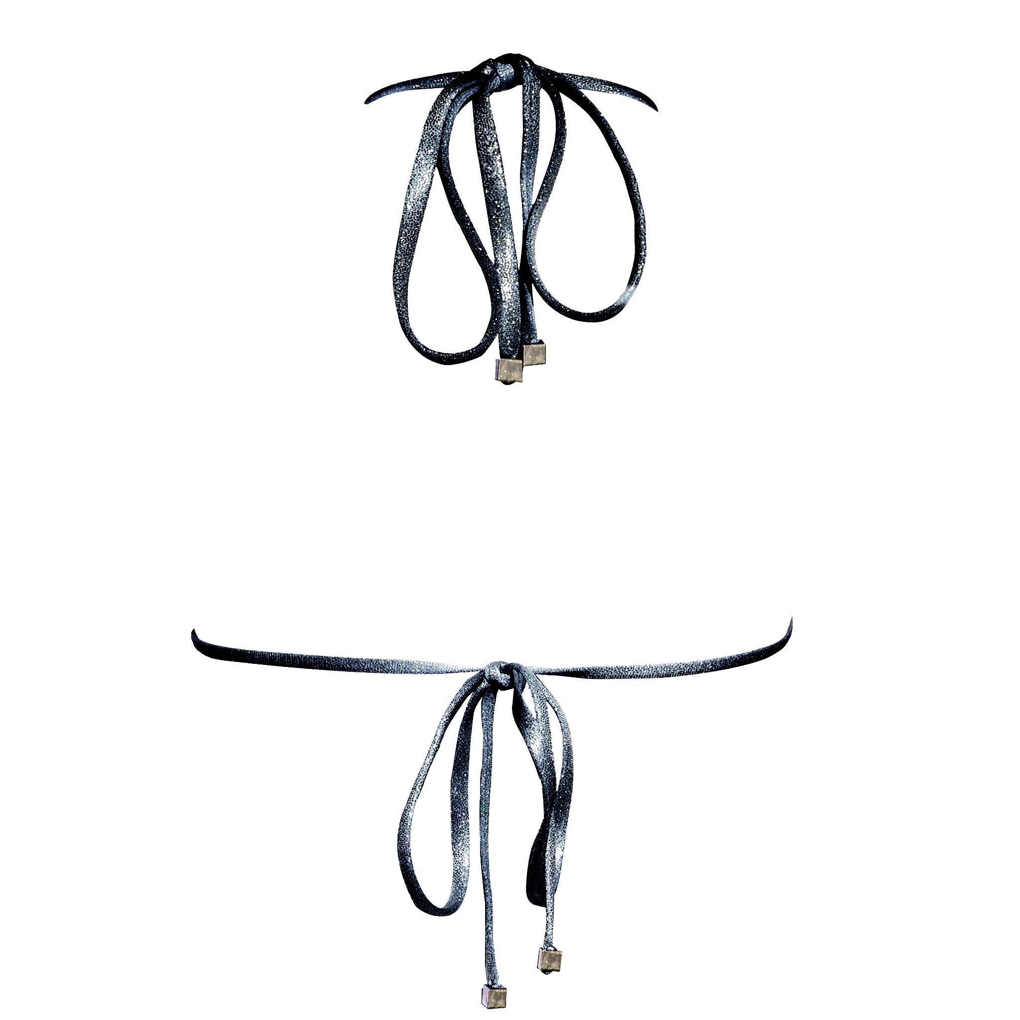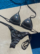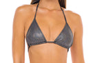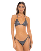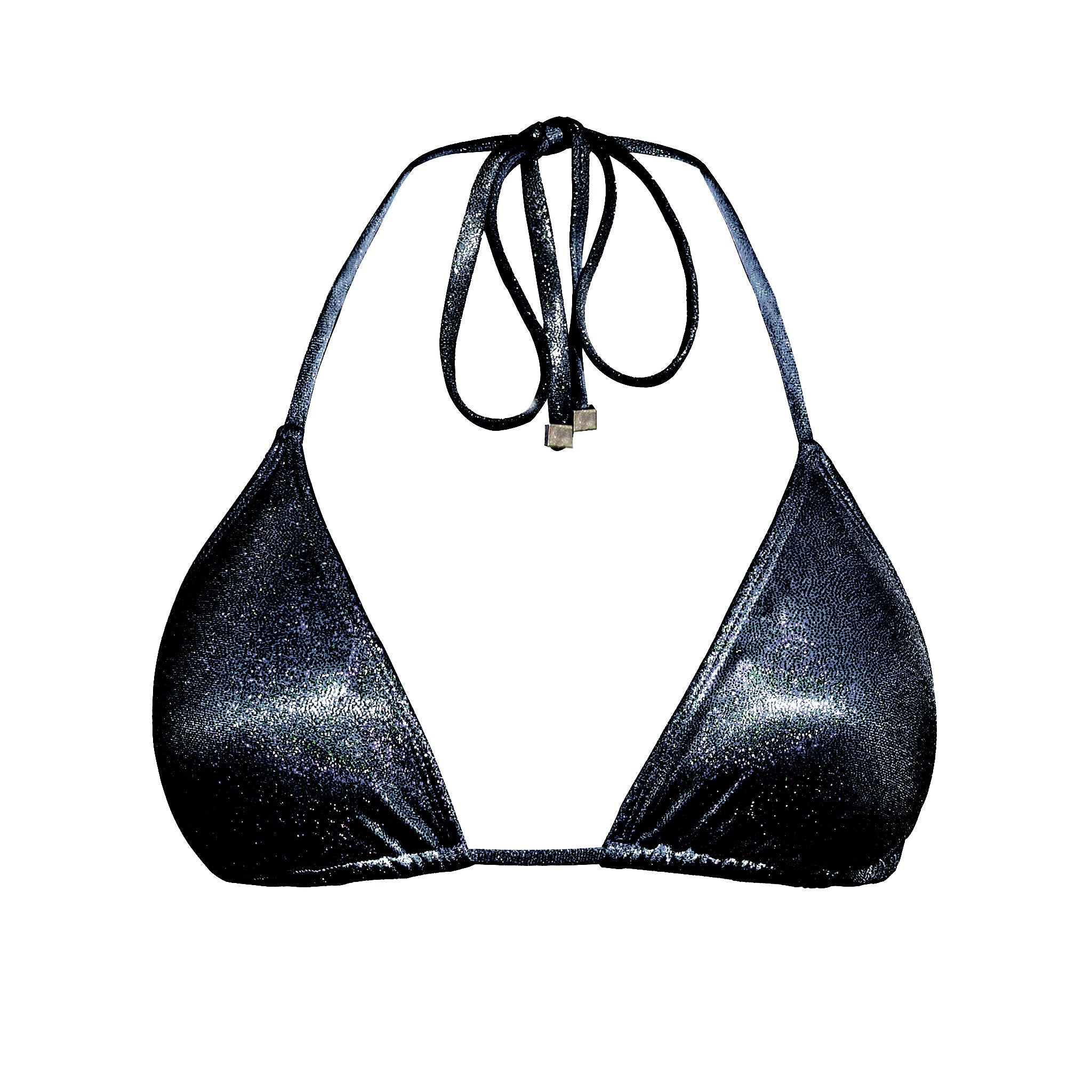 This gorgeous adjustable triangle top comes with gold beading at the ends of ties and is made from a sleek fully-lined, glittery material with soft to the touch holographic shine. Fabric is smooth and not scratchy. Comfy enough to wear all day long and comes with removable padding. The perfect attention grabbing bikini!