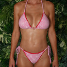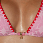 The Sienna top is an adjustable triangle bikini top crafted from soft, floral textured fabric and finished with ornate stitching along the trim for a subtle pop of contrast. The adjustable ties allow for a customizable fit that flatters, lifts and controls coverage. At the center, a gold charm with colorful beads adds a playful, beachy touch. This top is designed for both comfort and style, and includes removable padding for versatile wear all day long.