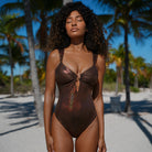 The Esme one-piece is a stunning full coverage swimsuit with a lace-up back and adjustable shoulder straps so you can custom fit it to you're own body. This suit features gold metal details for a luxurious feel. Suit comes with removable padding and is fully lined.