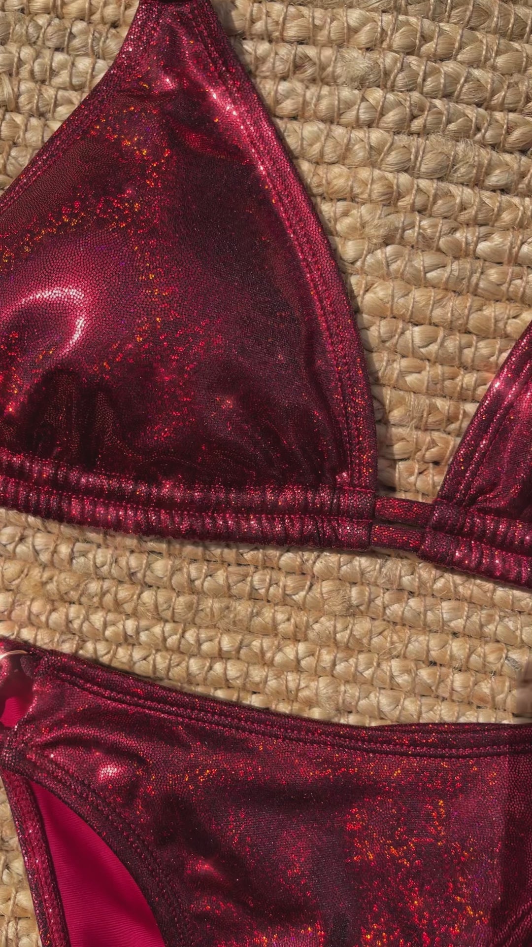 The Eden bottoms are a medium coverage scrunch bikini bottom with adjustable side lace-up straps featuring gold beading at end of ties. These bottoms are fully-lined and made from a sleek soft glittery material thats' comfy enough to wear all day long.