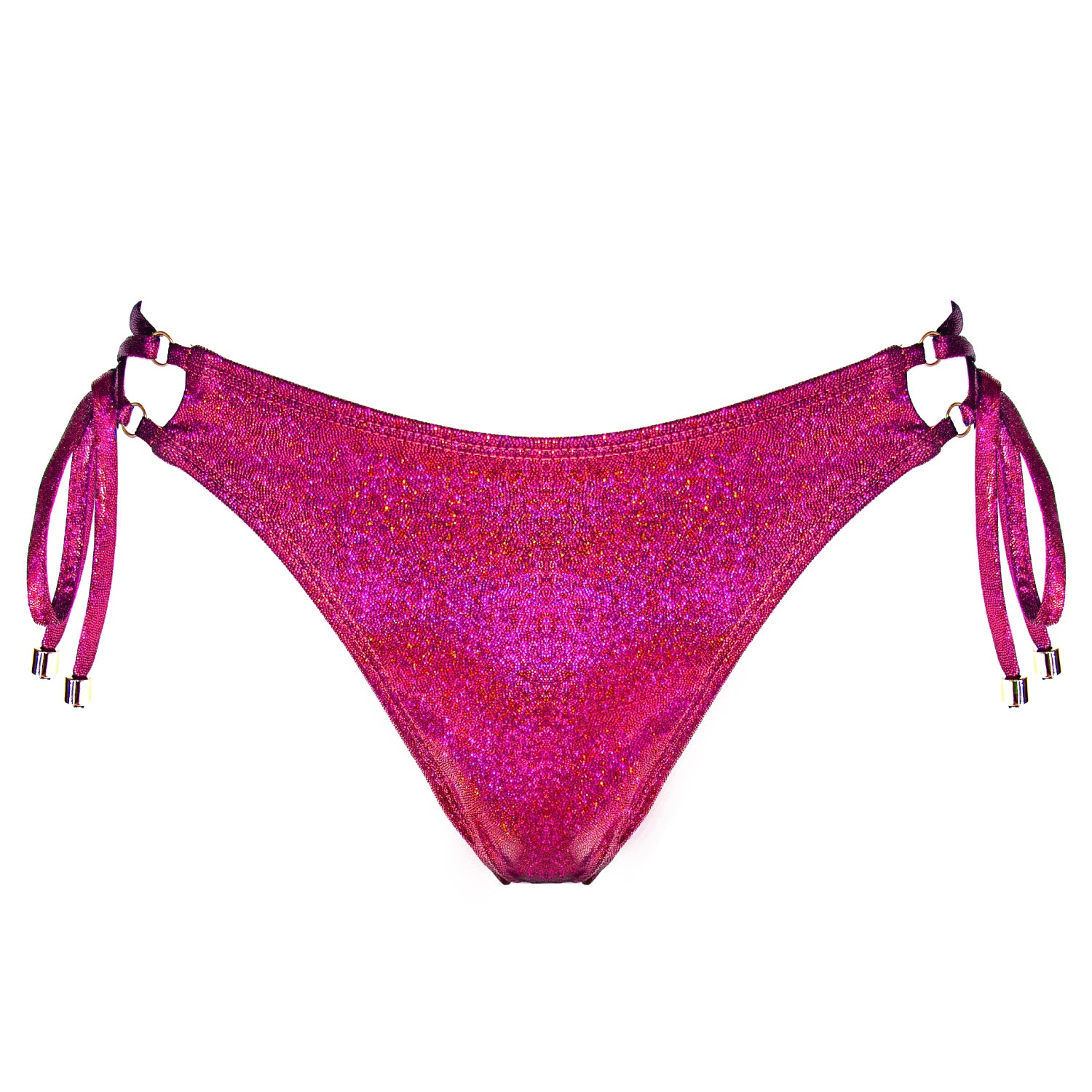 The Eden bottoms are a medium coverage scrunch bikini bottom with adjustable side lace-up straps featuring gold beading at end of ties. These bottoms are fully-lined and made from a sleek soft glittery material thats' comfy enough to wear all day long.