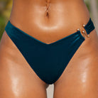 The Seylah bottoms have a wider coverage on the front and are adorned with a gold waterproof charm on one side. They can be worn high-waisted or pulled lower for a low rise fit. Back is a smooth full coverage.