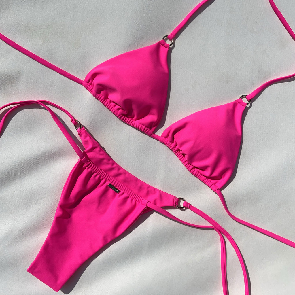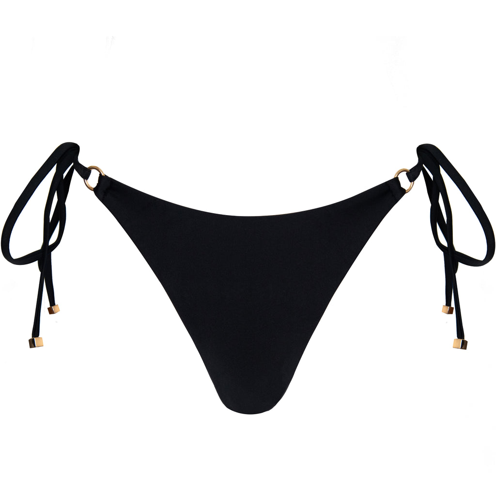 These thong bikini bottoms are adjustable with gold rings and gold beading at the end of the ties. Bottoms are made from sleek soft matte material- comfy enough to wear all day long. Thong back is sliding and adjustable to minimize tan lines and accentuate your curves.