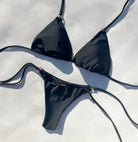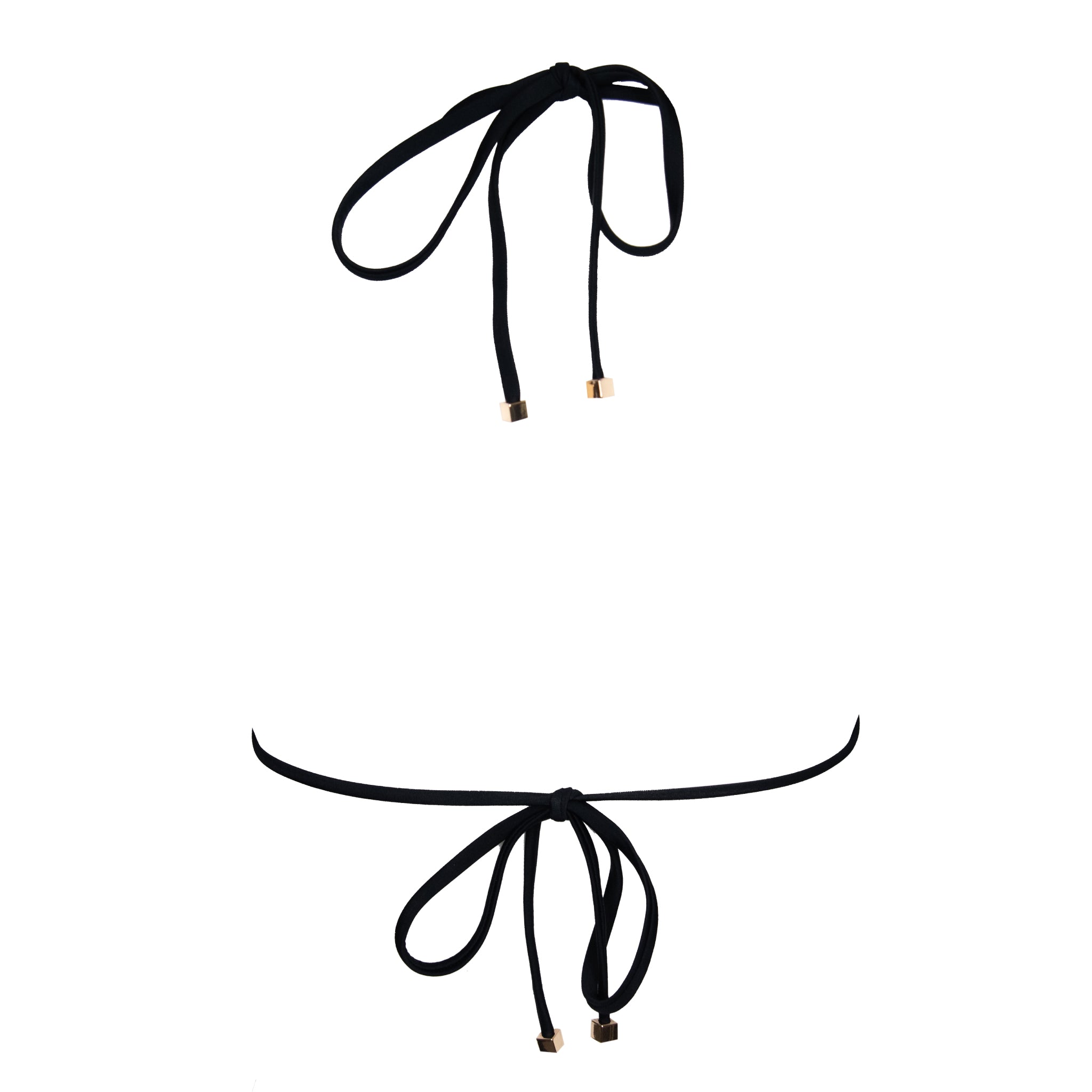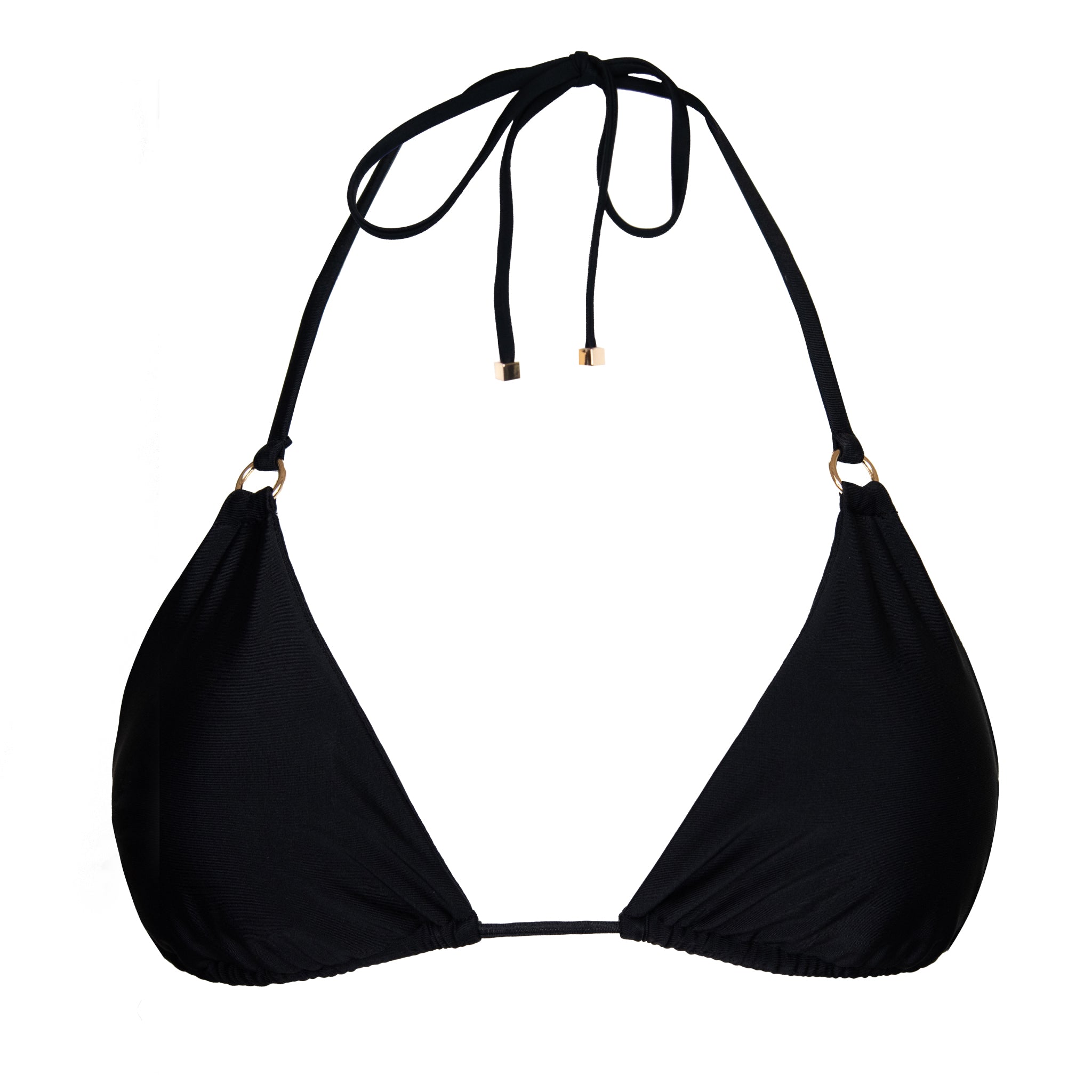 This adjustable triangle top features gold rings and gold beading at the end of the ties. Top is made from sleek soft matte material that's super comfy enough to wear all day long. Top comes with removable padding.