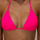 Adjustable Triangle top with gold beading at end of ties. Top is made from sleek soft shiny material- comfy enough to wear all day long. Top comes with removable padding.
