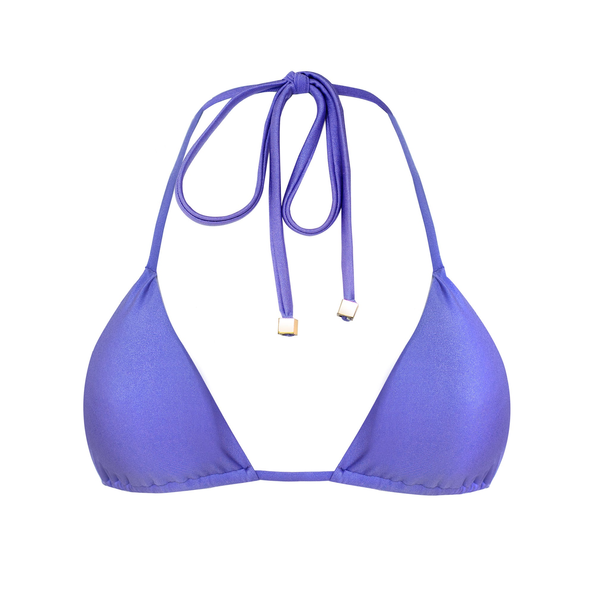 Adjustable Triangle top with gold beading at end of ties. Top is made from sleek soft shiny material- comfy enough to wear all day long. Top comes with removable padding.
