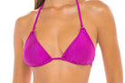 The Mira top is the perfect fitting triangle top featuring gold ring details at top of cups. This triple layered top made from super-soft semi-shine fabric comes with removable padding and gold beading at the end of ties for a subtle sexy and classy touch. This top is a must-have to be added to every bikini lovers collection.