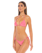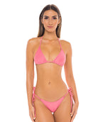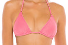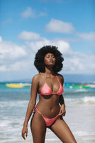 The Mira top is the perfect fitting triangle top featuring gold ring details at top of cups. This triple layered top made from super-soft semi-shine fabric comes with removable padding and gold beading at the end of ties for a subtle sexy and classy touch. This top is a must-have to be added to every bikini lovers collection.