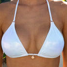 The Mira top is the perfect fitting triangle top featuring gold ring details at top of cups. This triple layered top made from super high-quality fabric that has a rainbow holographic sheen. This top comes with removable padding and gold beading at the end of ties, and a cute gold shell charm between the cups for a subtle sexy and classy touch. This top is a must-have to be added to every bikini lovers collection.