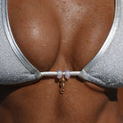 The Nyah top is an adjustable triangle style top that's meant to lift and cover in the right places ensuring the perfect fit. This top is made from sleek, soft sparkly material outlined in a smooth metallic stretchy fabric that's comfy enough to wear all day long. This top comes with a beautiful water-proof gold metal charm and beads in the center of the cups and comes with removable padding.