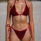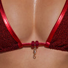 The Nyah top is an adjustable triangle style top that's meant to lift and cover in the right places ensuring the perfect fit. This top is made from sleek, soft sparkly material outlined in a smooth metallic stretchy fabric that's comfy enough to wear all day long. This top comes with a beautiful water-proof gold metal charm and beads in the center of the cups and comes with removable padding.