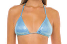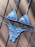 This gorgeous adjustable triangle top comes with gold beading at the ends of ties and is made from a sleek fully-lined, glittery material with soft to the touch holographic shine. Fabric is smooth and not scratchy. Comfy enough to wear all day long and comes with removable padding. The perfect attention grabbing bikini!