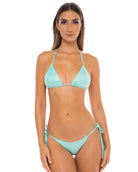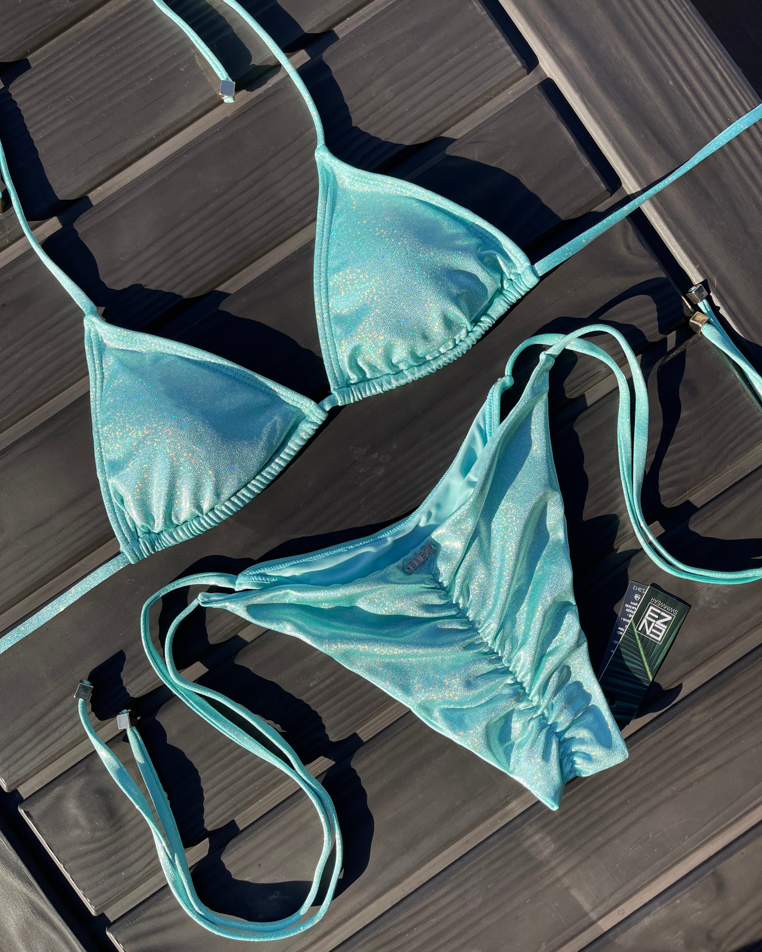 This gorgeous adjustable triangle top comes with gold beading at the ends of ties and is made from a sleek fully-lined, glittery material with soft to the touch holographic shine. Fabric is smooth and not scratchy. Comfy enough to wear all day long and comes with removable padding. The perfect attention grabbing bikini!