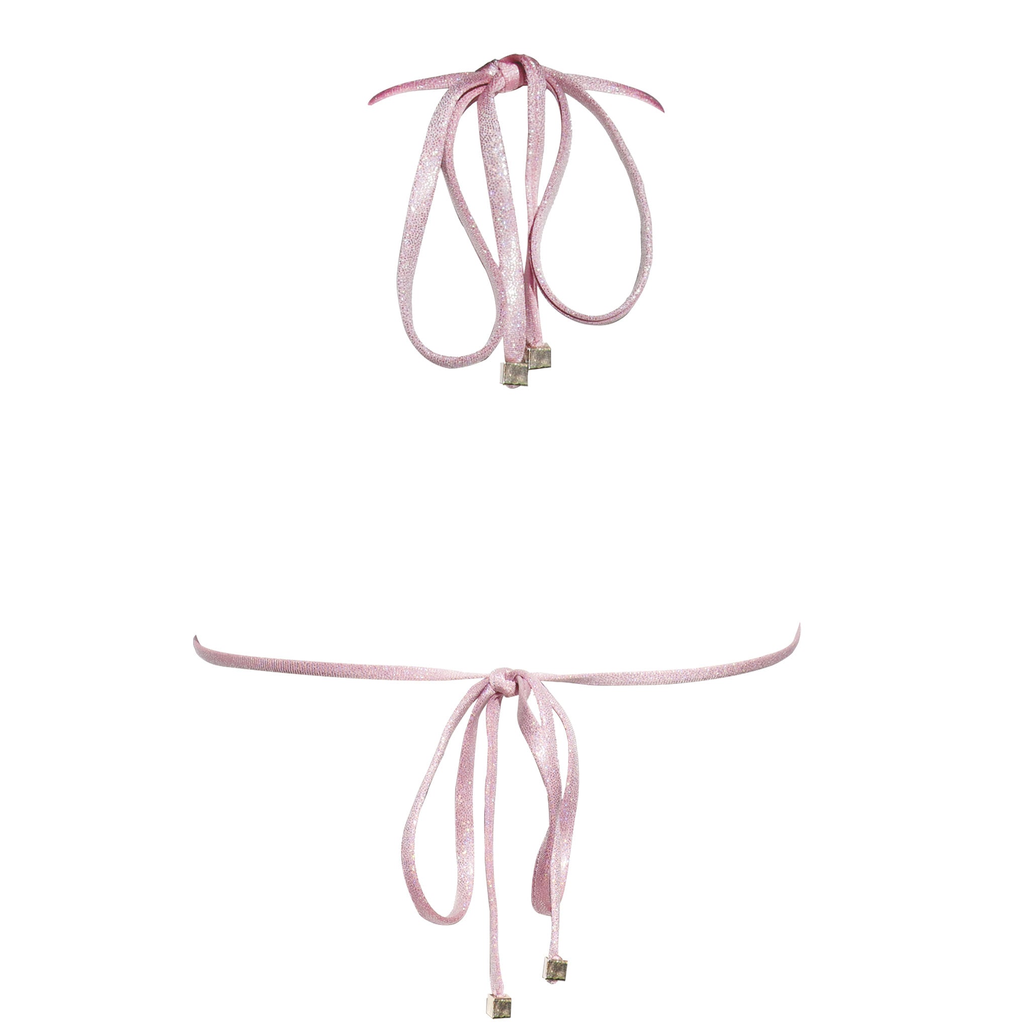 This stunning pink glitter bikini top features an adjustable triangle design with elegant gold beading at the ends of the ties. Made from a sleek, fully-lined, glittery material with a soft-to-the-touch holographic shine, the fabric is smooth and never scratchy. Designed for all-day comfort, it also comes with removable padding for customizable support. This eye-catching pink glitter bikini is perfect for those looking to turn heads at the beach or pool, combining both style and comfort in one must-have swimwear piece!